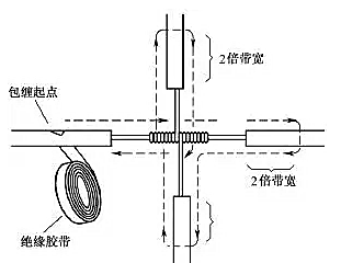 對導線的十字分支接頭進行絕緣處理時,包纏方向如圖22所示,走一個十字形的來回,使每根導線上都包纏兩層絕緣膠帶,每根導線也都應包纏到完好絕緣層的兩倍膠帶寬度處。